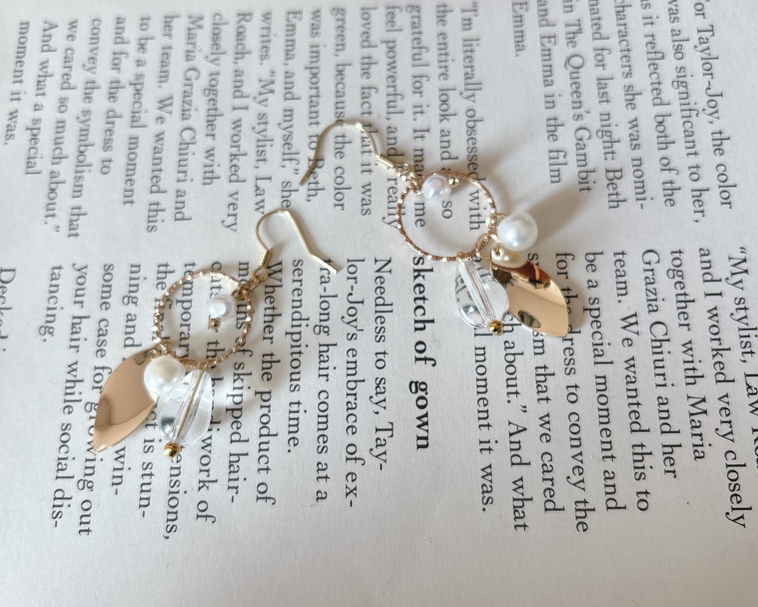 ゴールドリングにパール、ゴールドパーツ、クリアビーズの可愛いピアスです。