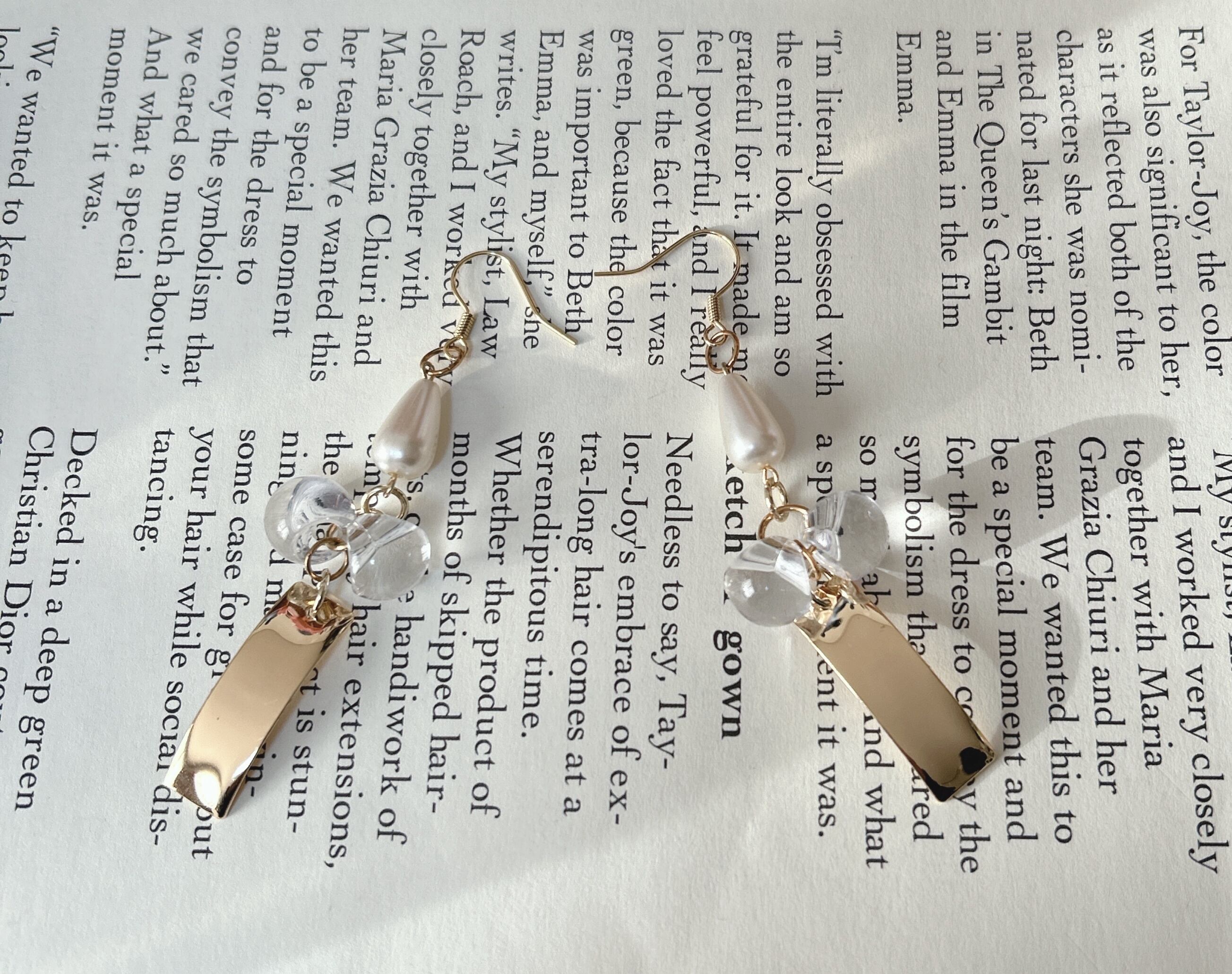 パールしずく、クリアビーズ、ゴールドスクエアバーピアス(イヤリング)